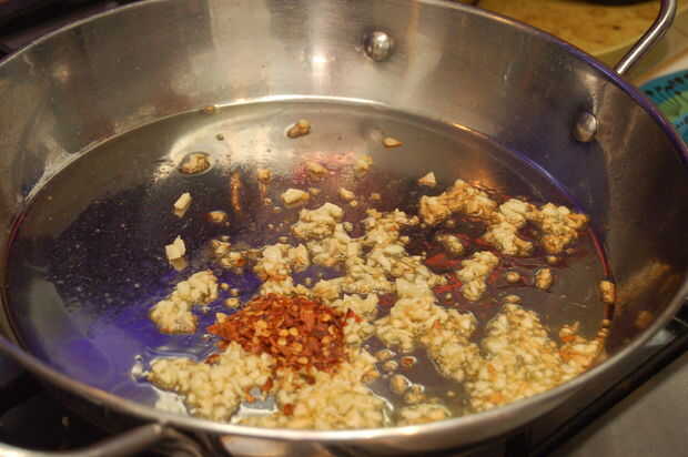 Con cuidado Vierta el aceite de la lata de anchoas y cocer los copos de ajo y Chile hasta que estén doradas.