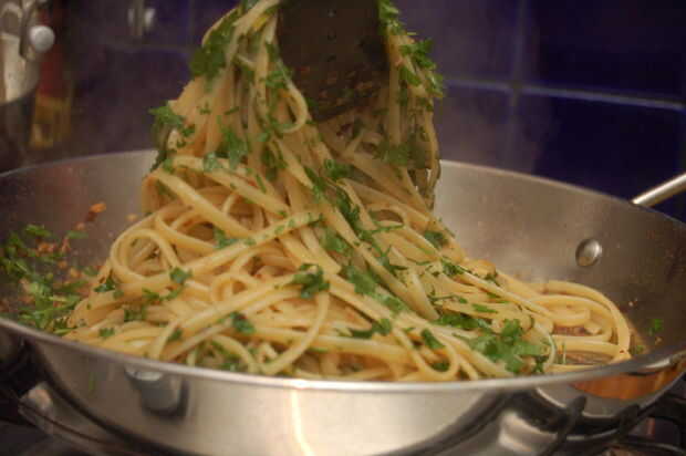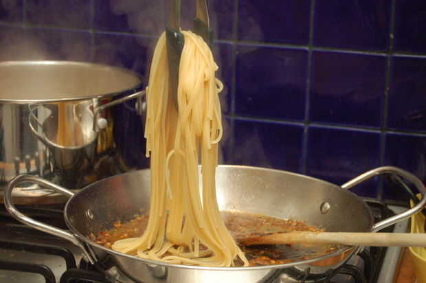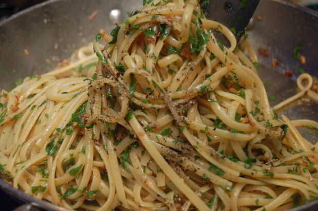 Linguine con pan rallado, ajo, guindilla y anchoa (6 / 7 paso)