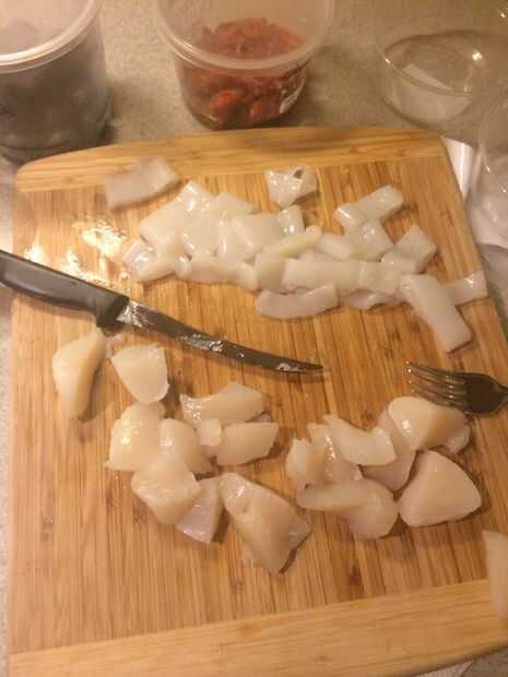 • Dependiendo del tamaño de tus vieiras necesitará picar en más pequeño, más morder pedazos de tamaño. Esto le ayuda a cocinar mejor y mezclar con el resto del plato.