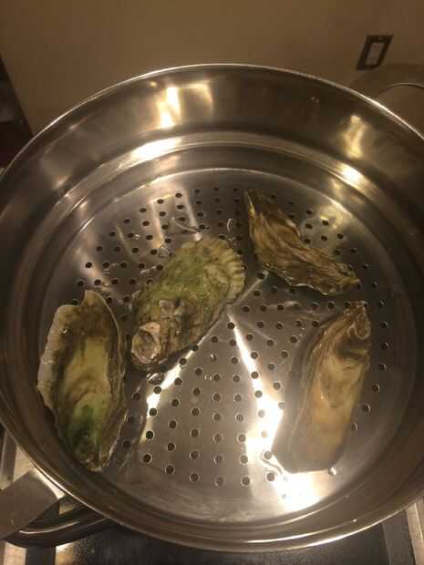 • Tome tus almejas y ostras y ponerlos en una vaporera y ponga sobre la estufa a hervir. Si usted no posee un barco de vapor, tomar un colador y colocar en una olla de agua. Establecer las almejas en el colador, pero asegúrese de que el agua no toca. El vapor hará que se abren, pero no queremos cocinar todavía. Ahora Levante fuera de la cáscara con el pulgar y lavarlos