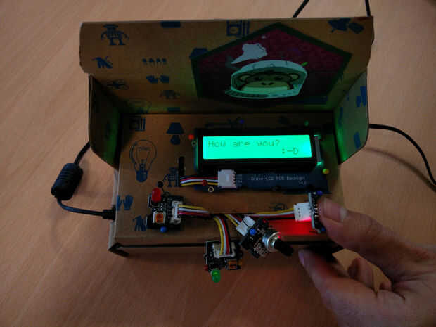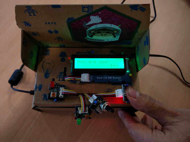 Una de las aplicaciones que hicimos vamos a compartir tu estado de ánimo con tu amigo utilizando un sensor rotatorio.