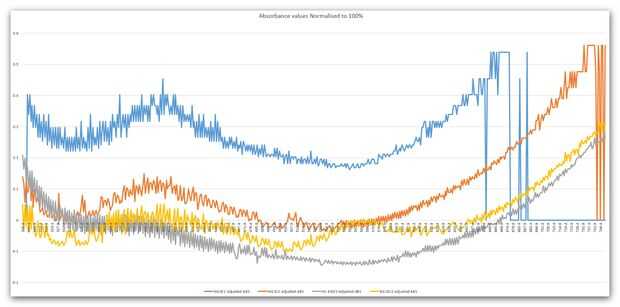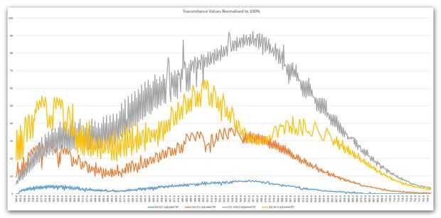 Los archivos de excel adjuntas contienen los valores individuales obtenidos para cada filtro. He combinado en un archivo adicional (normalizado) y luego ajustar los valores para que quepa en una escala de 100% transmitancia.