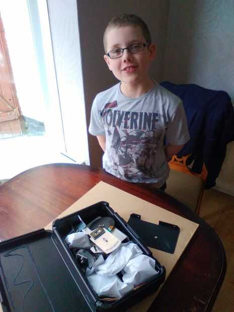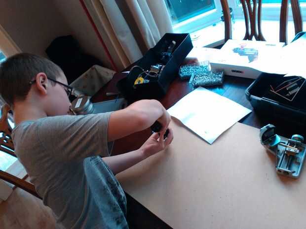 Mi hijo ha ayudado con la construcción del nuevo espectrómetro, poner a las piezas listo para ser fijado, entonces utiliza las plantillas de papel hechas anterior y trazar los orificios con un rotulador para dejar puntos en el MDF. Dejé entonces que use un piloto pequeño taladro para perforar cada punto.