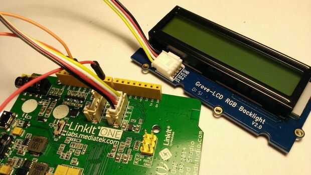 Siga el diagrama de arriba para conectar el condensador de misterio como el circuito mostrado. Continuación, asegúrese de conectar su Grove RGB LCD en la ranura de Grove directamente en el tablero un LinkIT.
