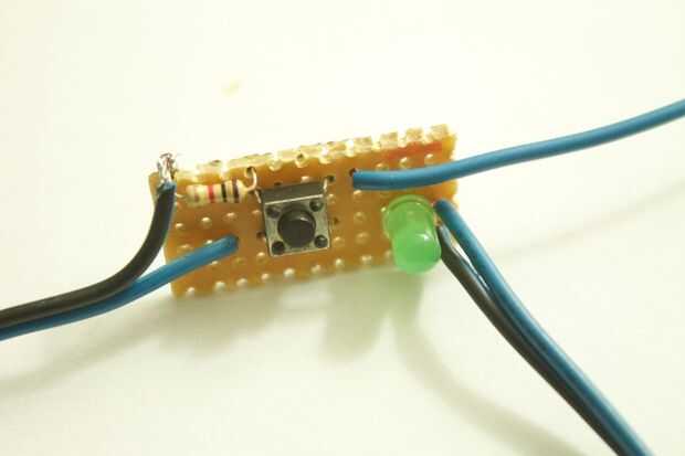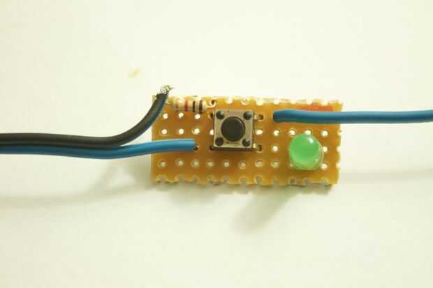 En su paso se suelda el circuito del botón y el led en el tablero de perf. Necesitamos un botón para este proyecto ya que es importante para nosotros poder apagar el ambientador de aire inteligente. Piense en cuando se rocía su dormir y repente el ambientador:). Así que vamos a añadir un botón que al oprimirlos se enciende y mantiene en el ciclo de pulverización hasta que se pulsa una vez más, esta acción convertirá apagado. El led está presente para decirnos que estado el ambientador de aire. También puede usar LEDs rojo y verde para indicar que pero en este ejemplo el led verde está apagado nos diga que el ambientador de aire está apagado.