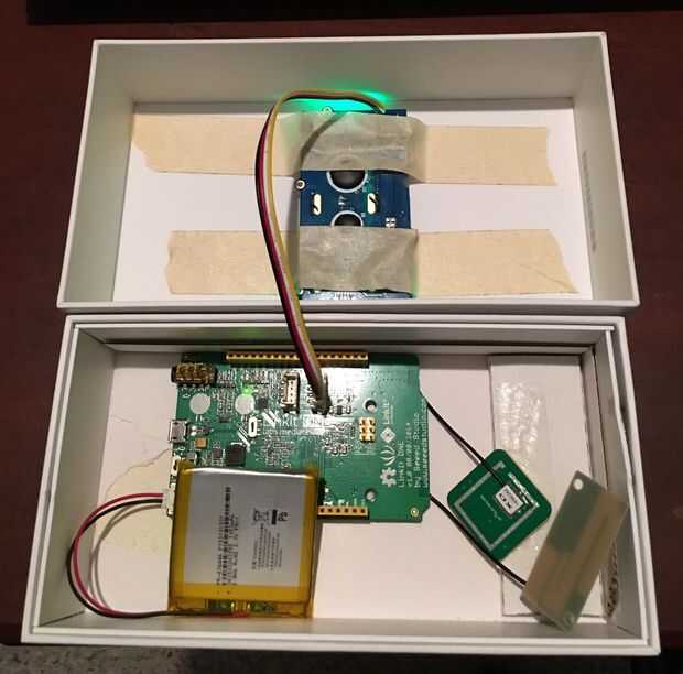 La foto de arriba muestra todo conectado juntos. Conecte las antenas GPS y GSM, conecte el LCD de Grove en el zócalo de I2C en el tablero un Linkit y en la batería. Usted también necesitará insertar la tarjeta SIM. Un cuadro anterior demuestra que mina insertada. Elegí a mi unidad en una caja de IPhone que tenía que poner todo para que sea cómodo de llevar para la prueba del paquete. Como ya he mencionado antes la pantalla LCD se utiliza para pruebas y monitoreo que todo está funcionando. Una vez que la fase de prueba, se retira para ahorrar batería y que la unidad más pequeña por lo que puede ocultar lejos más fácil.