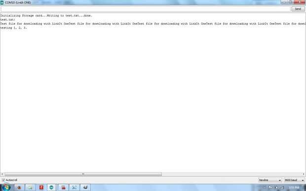 Subir el sketch de ReadWrite al su LinkIt (mismo taladro como antes pero esta vez se puede utilizar el dibujo como es, no hay cambios necesarios. usar la misma velocidad de comunicación de 9600. Después abres al monitor serial como antes y puede leer el archivo.