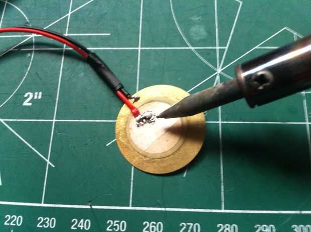 Más piezas (también conocido como sensor piezoeléctrico o disco piezoeléctrico) no vienen precableadas, así que puede que tenga que soldar dos cables en el piezo antes de que se puede utilizar. Soldar los cables a los piezoeléctricos puede ser un poco difícil al principio ya que fácilmente son dañados y vienen con una capa delgada sobre el centro del disco (la parte que se necesita soldar un cable en). Pero con práctica usted será capaz de tambor de 3-4 en ningún momento!