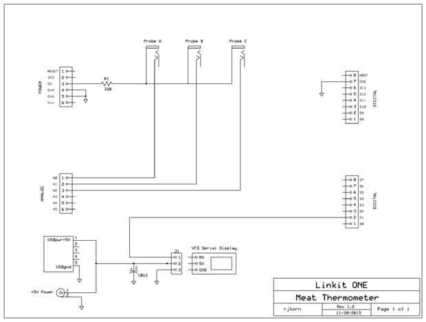 El esquema es tan simple como puede ser. Sólo necesita tres puntos. Un Linkit un tablero, un Display y sondas de temperatura. Puesto que las entradas analógicas son baja impedancia que tenía que poner los sensores en la parte alta. Usé el pequeño panel montaje de 3/32 auriculares de Radio Shack. Les alambré derecho a conectores de Dupont por lo que podría enchufar directamente a las cabeceras en Linkit uno.