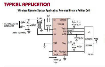 El LTC3108 juntada con la circuitería apropiada es capaz de dos voltajes tan poco como 20mv a 3.3v. Hice el circuito sugerido, como se muestra en la Página 1 de la hoja de datos que he incluido para su propia conveniencia.
