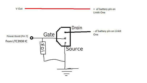 La salida de PGood será alta cuando Vout ha alcanzado la tensión correcta. Este utilizo para activar un MOSFET que permitirá actual para fluir a la Junta un LinkIt. Esto reduce la posibilidad de que el LinkIt uno será un desperdicio de energía cuando la salida cambia entre límites de tensión aceptables.