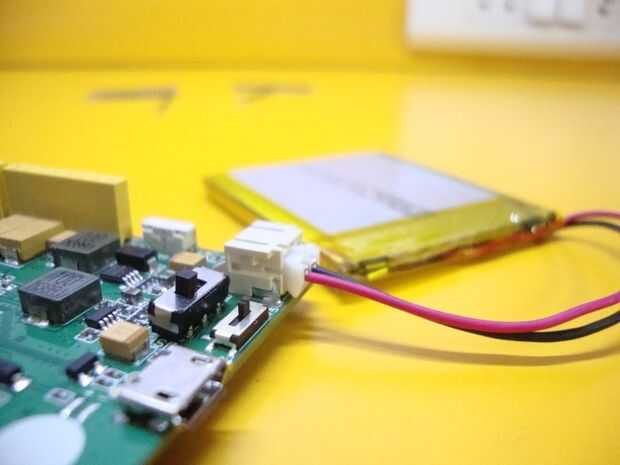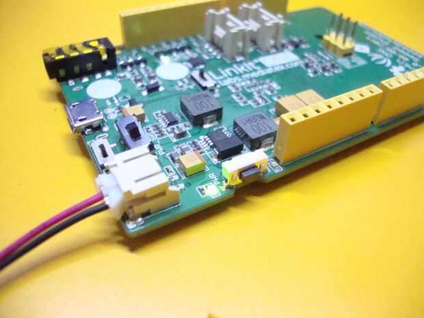 La batería siempre es un 3.7v 1050 mah li-ion que puede usarse para alimentar la Junta lo que es portable. Tiene un conector hembra en el otro extremo que tiene que ser enchufado en el conector macho en la esquina inferior izquierda del tablero. A bordo energía LED deberá encenderse para arriba si usted conecte la batería y deslice el interruptor a modo de batería.