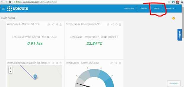 Vamos a empezar a tu dasboard de ubidots, haga clic en el menú de "Eventos" como en la foto.