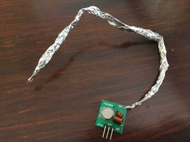Para que el transmisor para poder comunicarse con el receptor, tenemos que construir una antena externa. He encontrado que el papel de aluminio es lo suficientemente bueno como para el receptor poder recibir la comunicación.