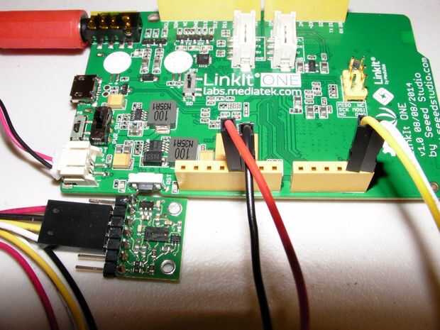 LinkIt uno viene con varias GPIO, para simplicidad de cableado utilizamos un portador de Sensor de distancia de tiempo de vuelo de VL6180X con regulador de voltaje a través de I2C. Los pasos son:
