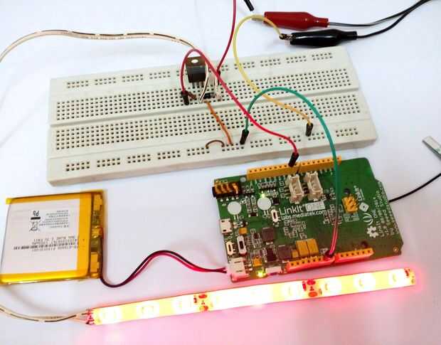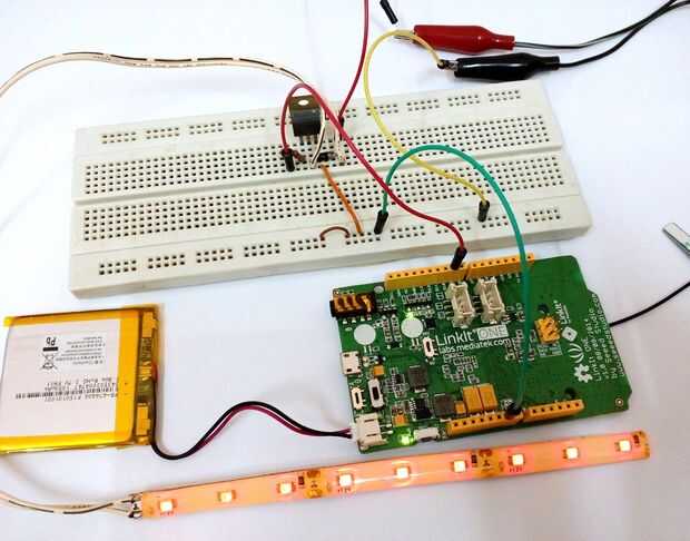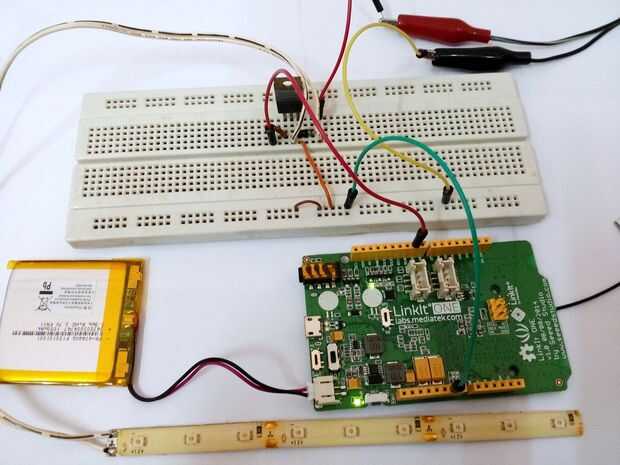 - Luego dar la tira de LED su energía (12v para mí) y potencia por LinkIt uno mediante USB o batería, con su antena bluetooth/WiFi también unido a él.