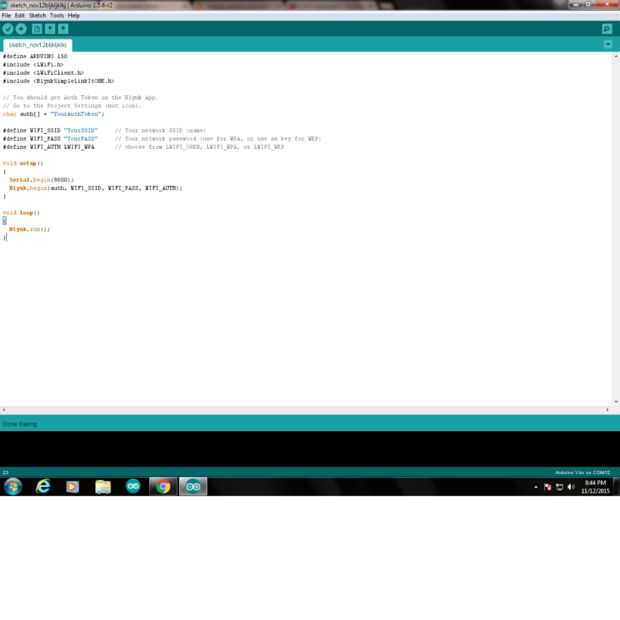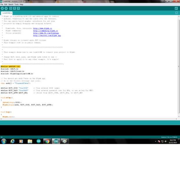 Código abierto como se muestra en las fotos y añadir una línea #define ARDUINO 150 en la parte superior donde comienza el bosquejo. También pega el símbolo que usted recibió por correo electrónico. Llene sus datos de wifi con contraseña.