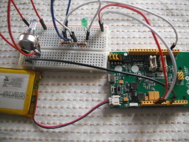 Medidor de voltaje mediante un potenciómetroPaso 1: Material potenciómetro deresistenciaalambreprotoboardLinkIT unoPaso 2: conectarPrimero conectar el potenciómetro. Porque es el más grande es la más difícil de conseguir en. Después de que conecte lo