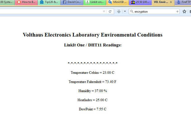 Un poco de información acerca de este Ible. Se trata de un tablero de dev de LinkIt uno (LIO) y un sensor de temp/humedad DHT11. El LIO Lee los datos de la DHT11 y actuando como un servidor Web crea una página web que muestra la información en cualquier ordenador conectado a la red doméstica. Con un poco de trabajo adicional puede hacer la página web visible desde cualquier ordenador conectado a internet. Mi primer tal instalación se hizo con un Arduino Nano usando un módulo de conexión por cable ethernet ENC28J60 y un DHT22. Puedes ver la página de configuración está generando en el http://volthauslab.ddns.net
