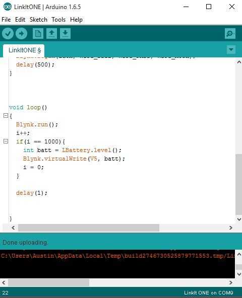 void loop() {Blynk.run(); i ++; if(i == 1000) {int batt = LBattery.level(); Blynk.virtualWrite (V5, batería); i = 0; } delay(1); }