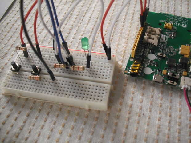 Juego de LEDPaso 1: Material LEDalambreLinkIT unoprotoboardresistenciasy un interruptor del tactoPaso 2: Conectar y codificación El juego utiliza un código desde el software de arduino. Antes de la codificación, utiliza la imagen para conectar todos