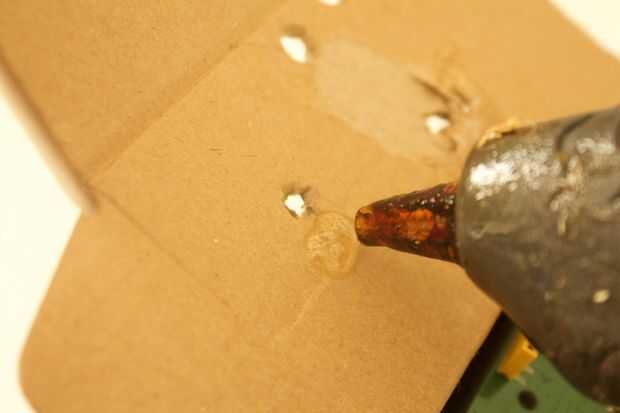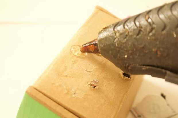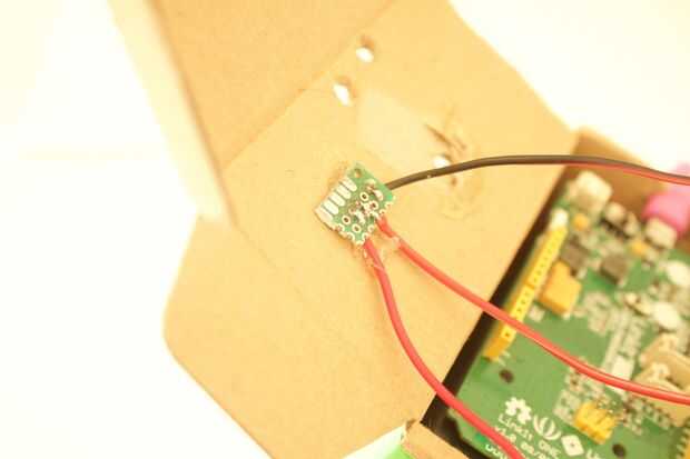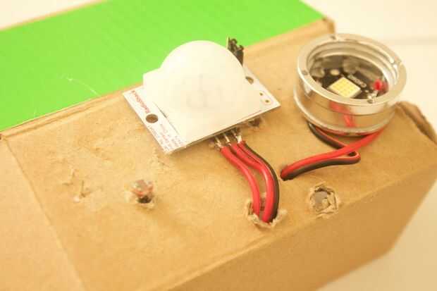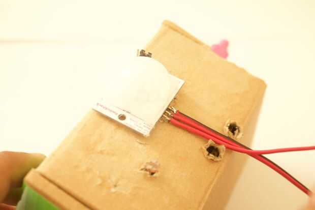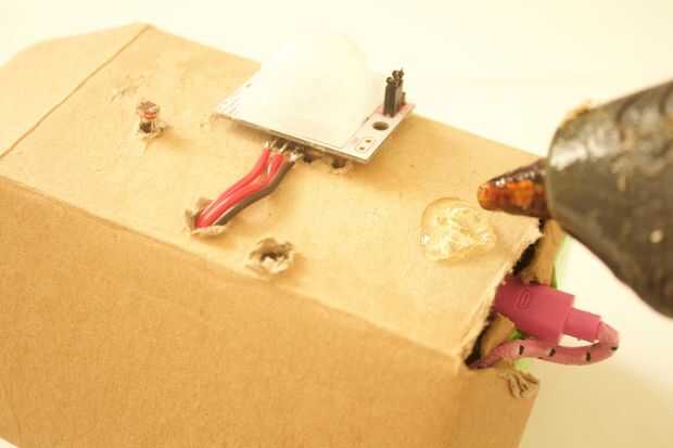 3. caliente el pegamento el Sensor de movimiento a la parte superior de la caja y poner los cables a través.