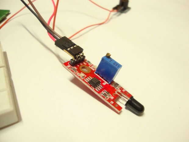 Ahora tienes que conectar el sensor de llama. Puede detectar las llamas a través de un fotodiodo en el frente. Conectar según los siguentes:
