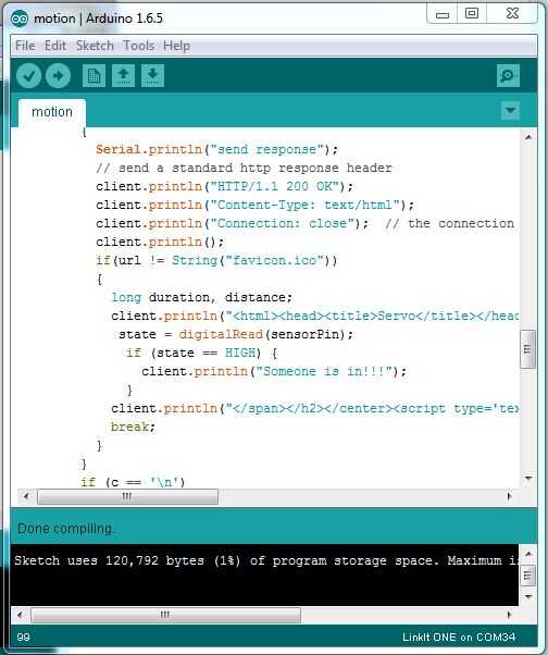 El código se puede encontrar a continuación necesita un IDE de Arduino con el plugin de LinkIt uno para subir el código a la Junta. También asegúrese de que usted introduzca su WiFi SSID y contraseña en el campo donde dice SSID y contraseña. Cargar el código en el Puerto Com adecuado.