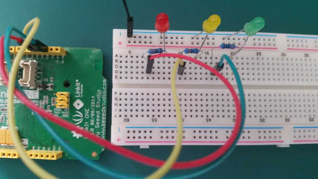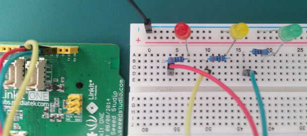 Así que para el rojo LED lugar uno de los extremos el cable de puente rojo en la columna 3 y el otro extremo del puente cable puerto D4 de la Junta uno de LinkIt.
