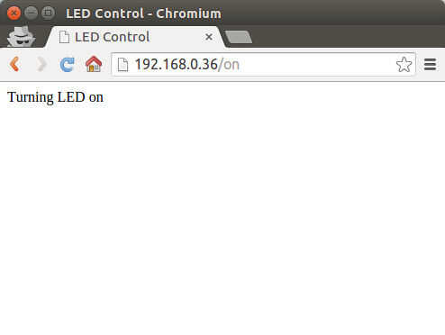Para controlar el LED con el explorador, busque la dirección IP (se muestra en el monitor serial en el paso anterior) y escriba en la ventana del navegador seguida sea /on o / off
