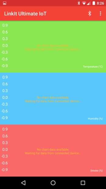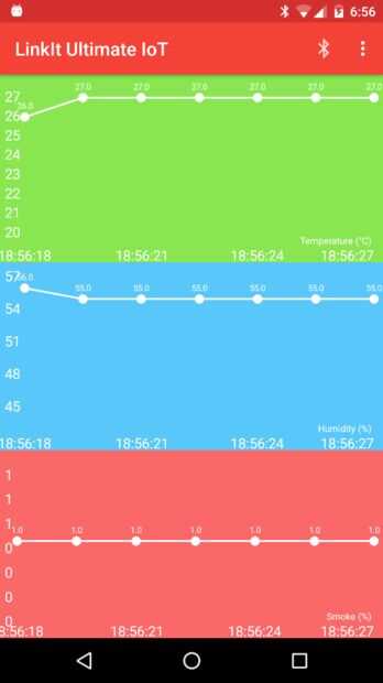 Cuando hay una conexión exitosa, valores comenzar consiguiendo subido a él y aparecen en sus lugares respectivos. LinkIt uno envía una cadena con formato a los valores y la aplicación automáticamente coloca en sus lugares respectivos.