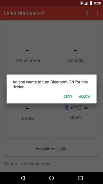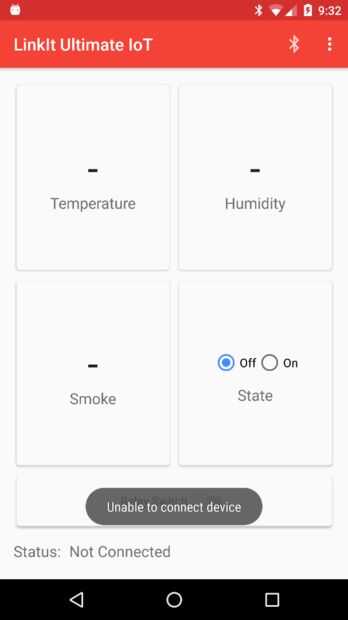 Una vez con éxito están emparejados con la ONE de LinkIt, abrir mi solicitud ' LinkIt IoT de Ultimate' (que previamente descargaste) en tu dispositivo Android (tienes que usar ese dispositivo cuya dirección MAC ha guardado anteriormente). Usted verá una pantalla como la arriba si Bluetooth está apagado.