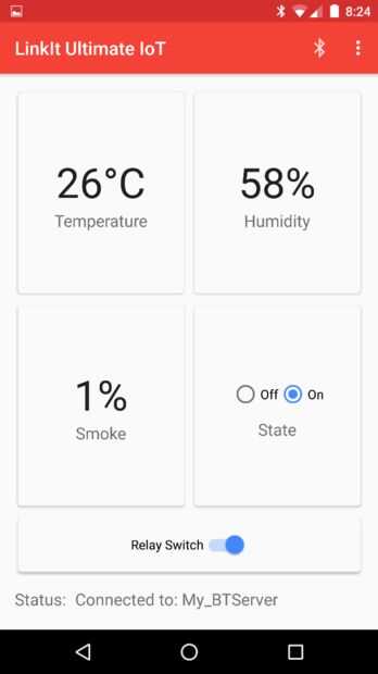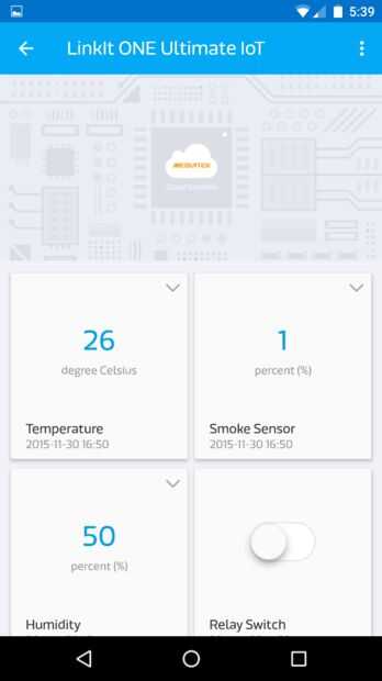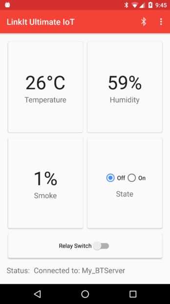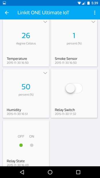 Usted debería recibir la temperatura, humedad y valores de los sensores de humo de LinkIt uno y también enciende el LED en el pin 13 debe (si ha configurado el pin del relevador como pin 13) cuando cambias de posición del interruptor en.