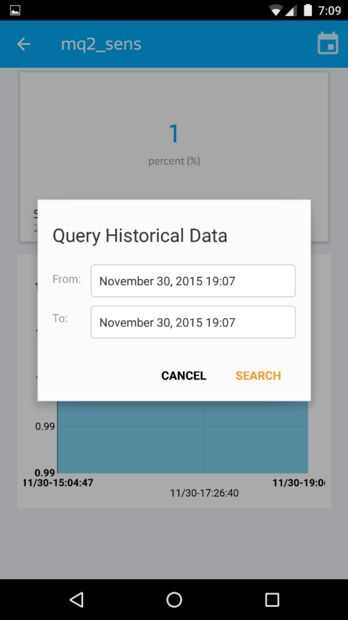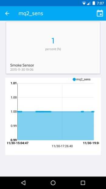 Puede controlar el pasador de relé, obtener valores de los sensores y si haga clic en la flecha en la parte superior derecha de un canal de datos como 'Temperatura', 'Humedad' o Sensor de humo, usted puede ver un gráfico que muestra todos los valores recibidos anteriores también.