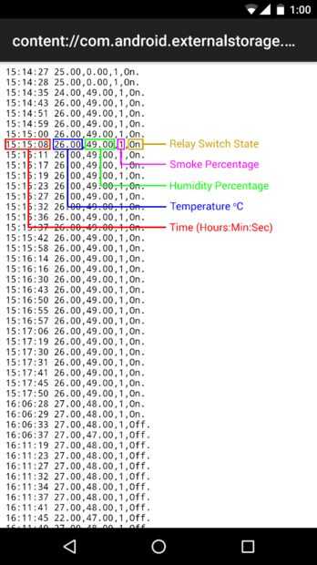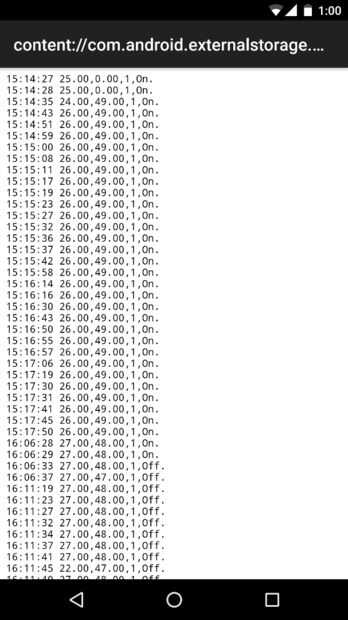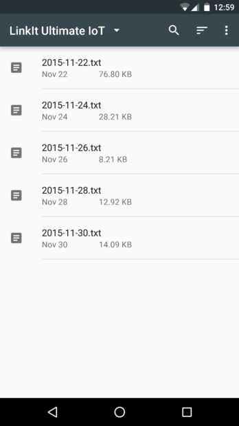 Te dije que antes de que el un LinkIt envía una cadena con formato para el dispositivo Android. Cuando se habilita el registro de datos, la cadena con formato de LinkIt uno se guarda como un archivo de texto en una carpeta en el almacenamiento de raíz de dispositivos Android, llamado 'LinkIt Ultimate IoT'. Se crea un archivo de texto separado para cada día, y aún almacena el tiempo con cada secuencia particular.