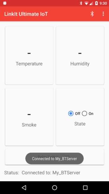 En primer lugar, usted necesitará emparejar tu dispositivo Android con su uno de LinkIt. Nombre del servidor de LinkIt uno será 'My_BTServer'. Esto debería ser fácil, y ya que varía para cada uno, basado en su dispositivo, no a publicar los detalles de cómo hacerlo. Pero asegúrese de: