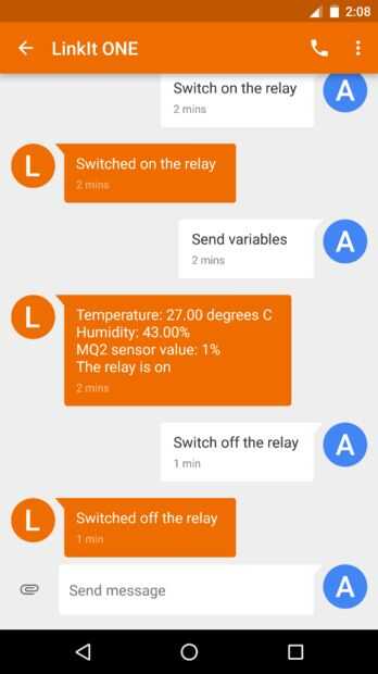 Incluso puede utilizar SMS para controlar el relé y solicitar variables de sensor, a veces cuando no tienes acceso a Wi-Fi o Bluetooth. Para ello, simplemente saca tu dispositivo Android. Si envías un SMS a la SIM en tu LinkIt, diciendo: "Encender el relé", después de algún tiempo, usted recibirá un SMS de LinkIt SIM que el relé está en.