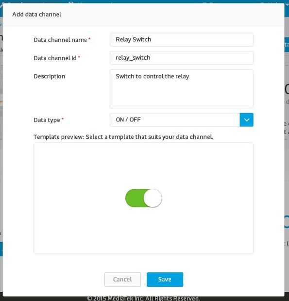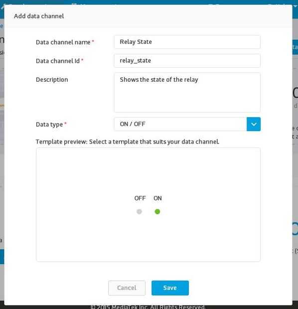 Luego añadir otro canal de datos para mostrar el estado del relé (seleccione 'Mostrar' para este también) y complete la información
