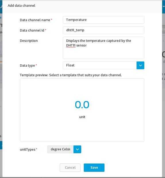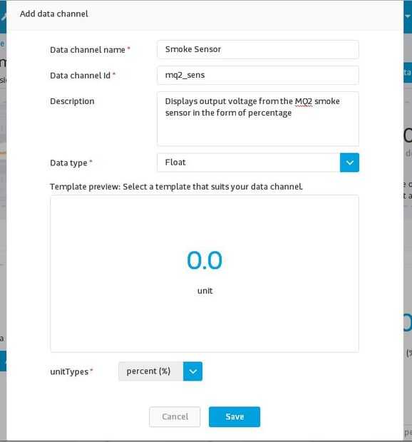 Haga clic en 'Guardar' y después de hacer esto, hacer que otros canales de datos para la humedad y el sensor del humo, seleccionar 'Display' como el tipo y relleno la información como en las imágenes de arriba