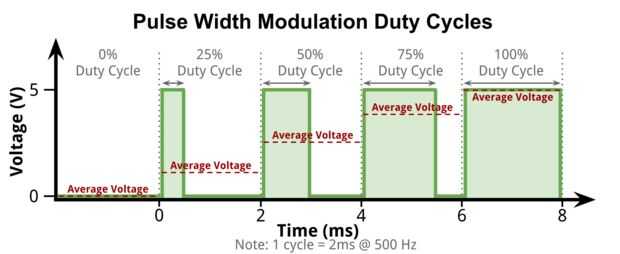 Las palabras de modulación de anchura de pulso son casi auto explicativo. Todo lo que es una señal eléctrica que es pulsado (como tu corazón hace que el pulso de la sangre) y pueden variar en ancho (longitud realmente). Mirando un osciloscopio de la señal PWM muestra una onda cuadrada. Qué tan amplia es que onda determina el pulso. Cuanto más amplia sea la onda más el pulso. Esto le permite hacer muchas cosas, una de ellas es desaparecer un LED arriba y abajo con una salida digital. Digital sea encendido o apagado. Una penumbra es una función análoga en que no es por fuera pero brillante, un poco menos brillante y finalmente apagado (oscuro). También puede controlar motores con PWM haciéndolos funcionar a velocidades variables. Arriba es que una foto de un osciloscopio que muestra cuando se envía una señal PWM a él. Para una explicación detallada, visite este enlace