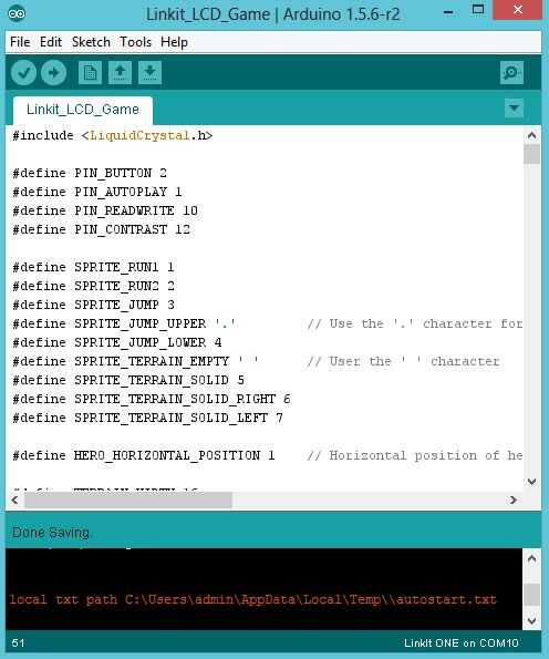 Comience por asegurarse de que tiene el IDE de Arduino para Linkit instalado en su computadora. Descargue el archivo Linkit_LCD_Game.ino en esta página en su computadora y abrirlo con el software Arduino Linkit. Asegúrese de que la Junta está configurada correctamente para programación (herramientas → tablero →Linkit uno). Conecte el Likiy al ordenador mediante el cable USB. Esto proporciona energía al juego y le permiten subir su programa a la Junta. En este punto, deberá encenderse la pantalla de la pantalla LCD.