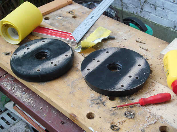 La placa superior, que lleva toda la fuerza era un poco más pequeña, para hacer más fácil de quitar: x18mm 42 x 28 cm. (16,5 "x 11" x 0.7 ") Y consta de 3 piezas encoladas apiladas. El diámetro interno de la parte superior es cerca de 1.5", 38mm.