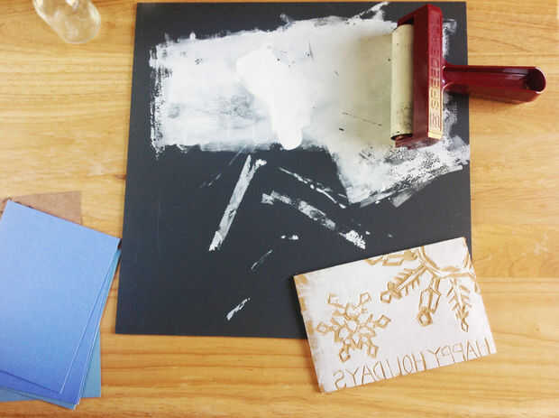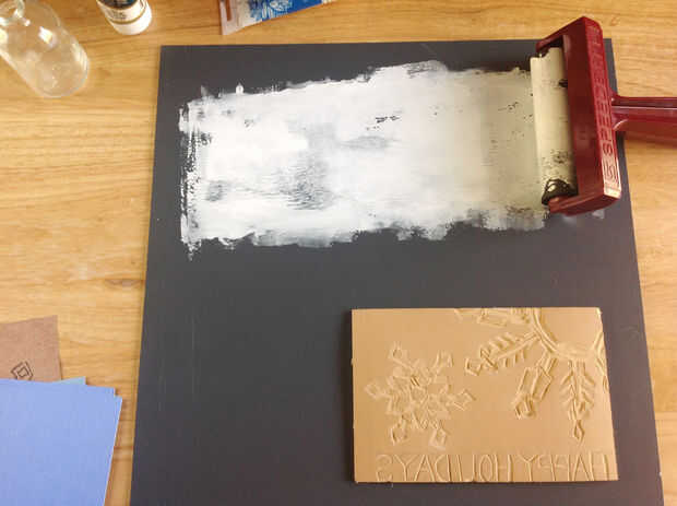 Ruede su tinta para arriba brayer a su bloque y asegúrese de que cada parte está adecuadamente cubierto. La tinta debe buscar finamente texturada, no liso o áspero. Creo que una lija super fina.