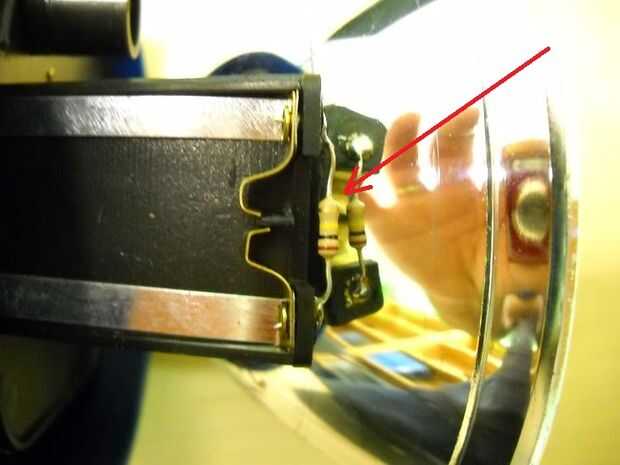 La mayoría de la linterna tiene 2 modos. Encendido y apagado. Puede realizar otra mejora en esta linterna (5-8 centavos más) para los modos "on" y "localizador" mode (modo localizador también conocido como "tío, ¿Dónde está mi linterna?" [WMF modo]). Mi linterna, había soldado una resistencia de 100K ohm a través de la parte posterior de los contactos del interruptor como se muestra. Así que cuando la linterna está apagada, es en solo un poco para que el led brilla tenue pero lo suficientemente brillante para ser visto fácilmente en la oscuridad. Esta característica puede utilizarse mejor extendiendo el LED o LEDS con alambres y caliente pegando a un agujero en el disco plástico transparente en la parte frontal de la linterna. Esto aumentará el ángulo de visión del led a 180 grados completos y también anulará la garantía de por vida en la linterna de $3,50.