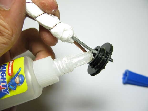 5.) insertar ambos metal tiras a través del agujero de la polea y el sello / impermeable con epoxy / pegamento / hotglue.