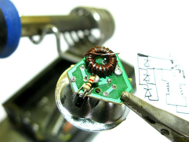 Si ya sabes cómo construir uno, sólo puede seguir el sencillo diagrama de arriba. Necesitaba hacer mi circuito más compacto para que había soldado mi transistor debajo de tablero de LED mientras que el núcleo toroidal fue pegado sobre el tablero de LED.