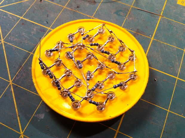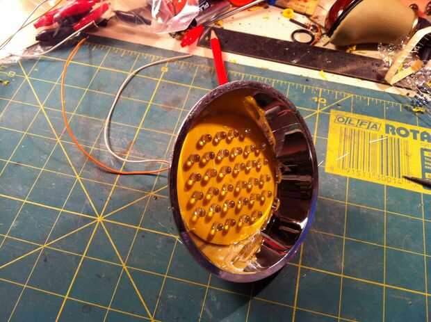 Una vez que todos sus pares se conectan en paralelo y tiene un solo positivo y negativo, conecte un cable a cada uno y ampliar estas conexiones. No es una mala idea para aislar los puntos de soldadura para estos dos cables con un tubo del encogimiento del calor o cinta. Prueba tu luz con la batería de 6v y asegurar todos los LEDs encienden. Si no, examine las conexiones a los LED que no enciende. Pase los dos cables de su reflector y asegure el disco con algun pegamento. Ahora tienes una lámpara de LED terminada lista para su instalación.
