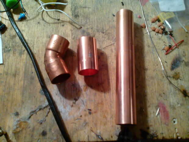Para mí personalmente, no hay muchos materiales más atractivo que el cobre brillante, tiene un destello tan hermosa a ella. Como dije antes, he encontrado que las lentes encajan en el tubo de cobre muy cuidadosamente, lo que es el medio ideal del edificio. La luz está hecha de una longitud de tubería, un acoplador recto y un 45°. Estas piezas estaban muy sucias cuando me enteré de ellos, por lo que utilicé un poco de papel de lija de grano 220 y 600 y lana de acero, creo que la 0000, para limpiar y pulen. Yo estaba muy contento con el resultado.