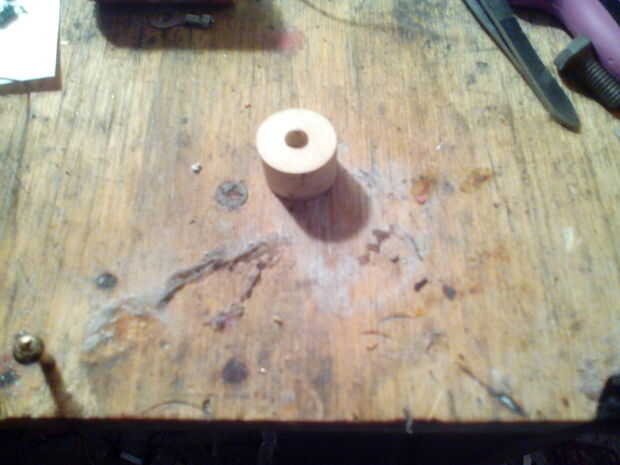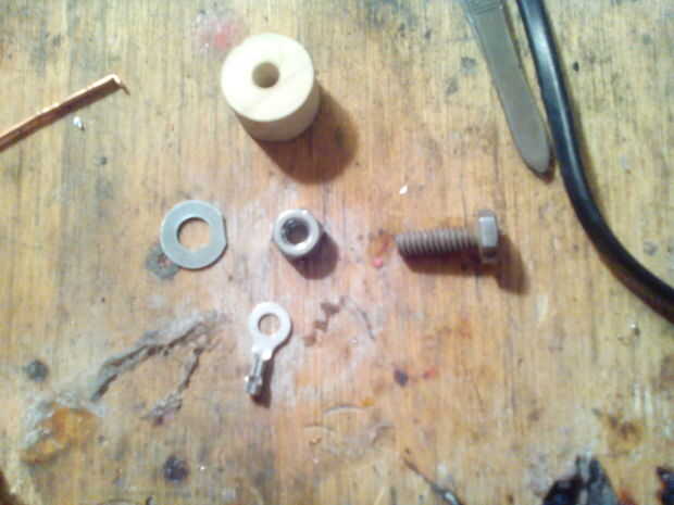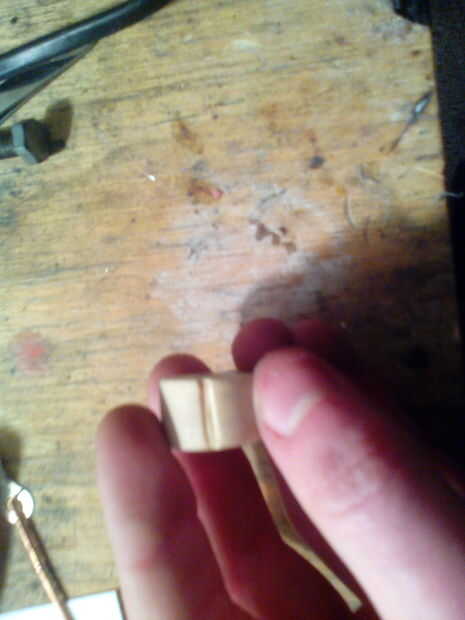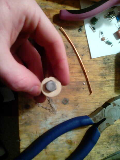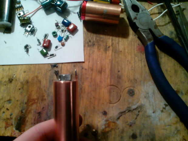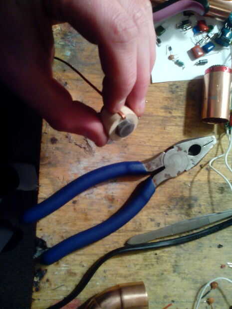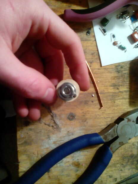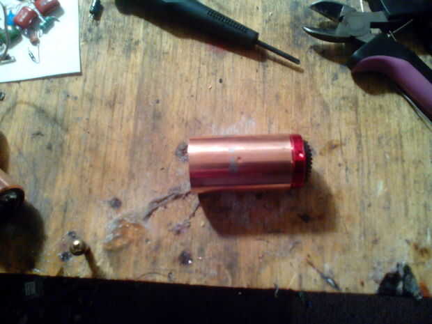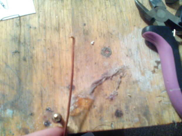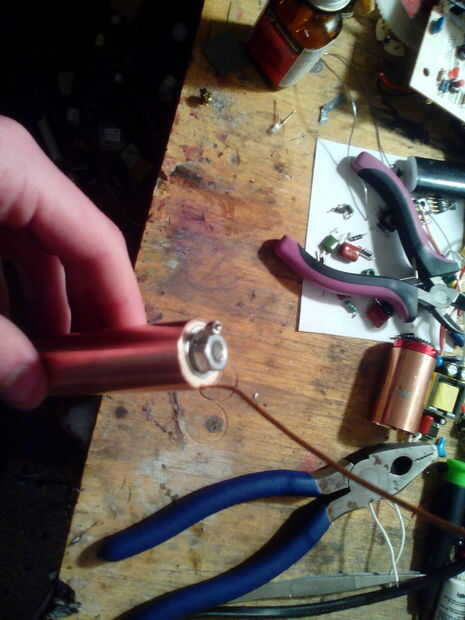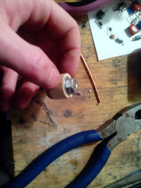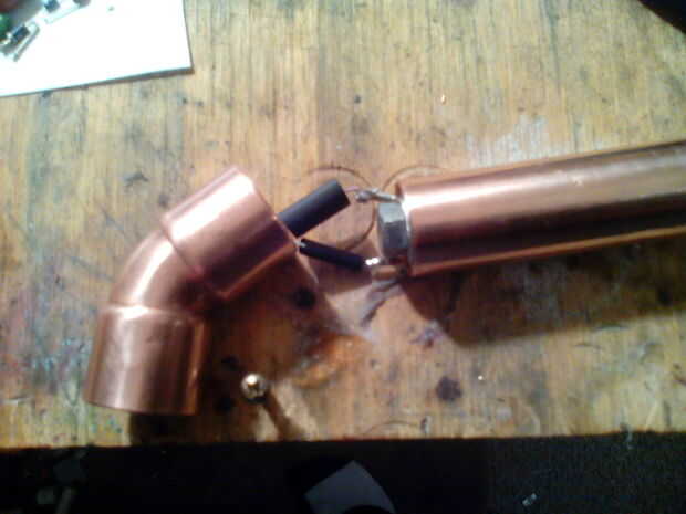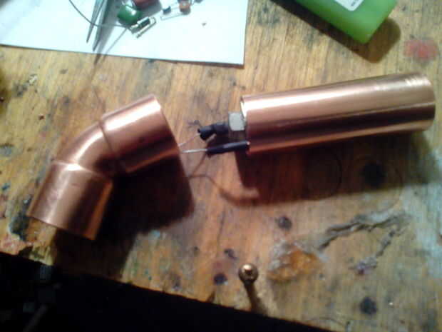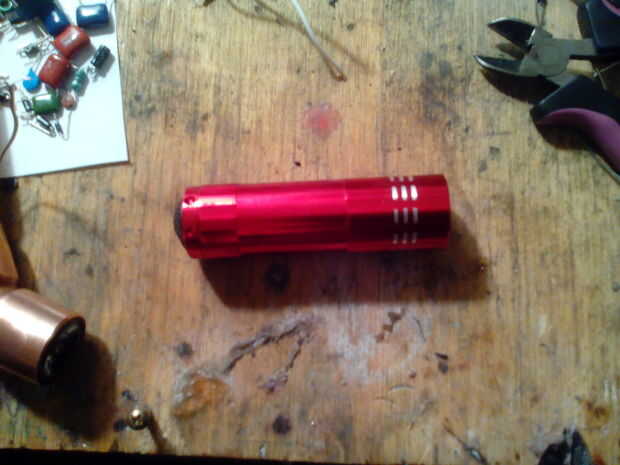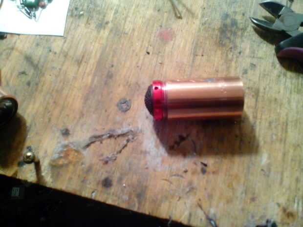 Agrupan estas dos porque están tan estrechamente entrelazados, como regla general, cuanto más simple es algo, más difícil es romper. La tubería de cobre realmente sirve dos propósitos, 1: se ve atractivo y 2: es difícil. Tubería de acero, verdadero sería más fuerte, pero no estoy realmente con la intención de tirarlo de un acantilado, así que cobre es lo suficientemente buena. Mientras pensaba acerca de cómo podría hacer que la electrónica tan simple como sea posible, me encontré con uno de ésos linterna aluminio barato, uno de los que utiliza tres pilas AAA. Utilice la caja de aluminio como electrodo e incluyen el interruptor en la base, que es casi tan simple como obtiene. Tenía otra suerte aquí, el interruptor de la linterna de aluminio encaja casi perfectamente en un acoplamiento de tubo de cobre 3/4 de pulgada, exactamente lo que estoy usando. Así que simplemente, presiona con un poco de ayuda de un martillo. El ajuste apretado también asegura una buena conexión eléctrica entre el interruptor y la tubería de cobre. Por lo tanto, al igual que la linterna de aluminio, la caja de metal se utiliza como un electrodo. El otro es un simple tornillo pegado a través de un tapón de madera. Usé alambre-lazo-algo (lo usado para atar un cable a un tornillo) y usted lo conjeturaba, sirve para conectar un cable al perno. Ver las fotos para hacerse la idea. Hay una terminal para conectar el LED, pero el otro es el cuerpo de tubo de cobre. Mi primera idea fue soldar un alambre en el interior de la tubería, pero esto resultó imposible para mi soldador. En cambio opté por un cable entre el tapón de madera y el tubo de cobre de la cuña. Entonces pude soldar los conductores de este cable en vez de directamente a la tubería desde el led. La electrónica es tan simple como se pone, el led está conectado directamente a la cosa de bucle de alambre y el alambre de la cuña. Esto permite que el led conectar directamente a la batería, lo que significa que atrae a cerca de 500 MA en vez de los 350 se supone que MA. El consumo de energía es cerca de 2 vatios, si es un 1 vatio led, pero está bien. Si usted quiere traer la energía a 1 vatio, simplemente use un resistor en serie con el led. Sólo soldados y calor-encogimiento-tubería-ed el led lleva alambre-lazo-lo y la cuña, entonces prensado el 45° de acoplamiento en el extremo de la tubería, sobre el tapón de madera.