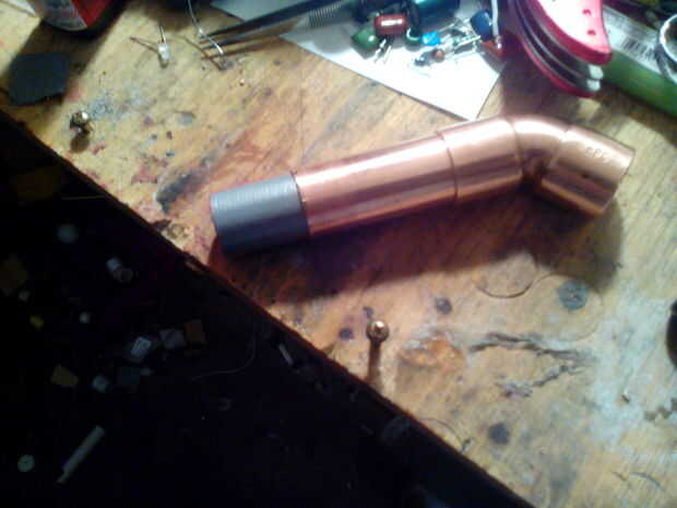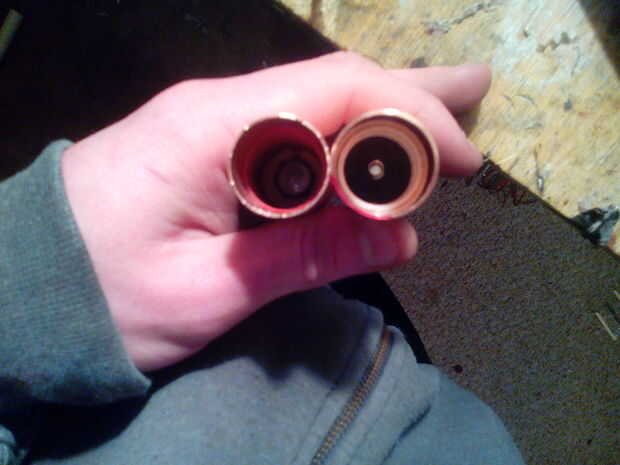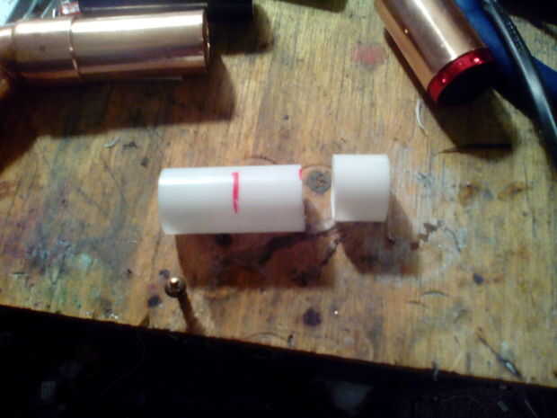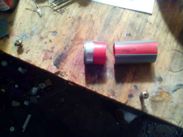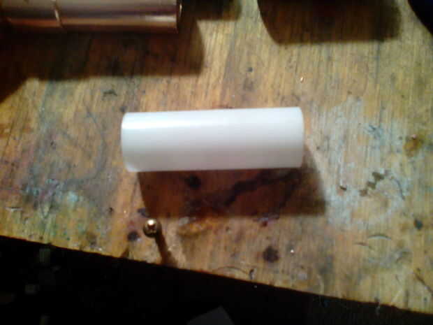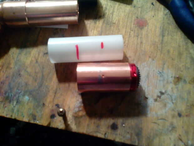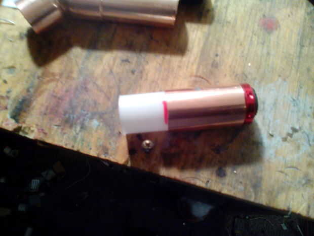 Una linterna super brillante, durable, atractivo es grande, a menos que la batería solo dura 4 segundos (bueno un poco exagerada, pero usted consigue el punto). Por duración de la batería también es muy importante. Resulta que una pila 18650 de litio ion encaja muy bien en una cáscara de la escopeta, que a su vez encaja perfectamente en el tubo de cobre de 3/4 de pulgada. El acoplamiento adapta una batería 26650 muy bien, pero una batería 18650 está un poco flojo. Así que corte un trozo de un tubo adaptador 26650 de 18650 y había pegado en el acoplamiento en el extremo del interruptor. También corté una cáscara de la escopeta (usado por supuesto, no cortar un redondo vivo) y atrapado en el cuerpo de la tubería. Asegúrese de cortar el cuerpo de la tubería a la longitud correcta para la celebración de la batería. Para mantener la batería en apenas presione el acoplamiento en el extremo de la tubería, la presión es suficiente para mantener la batería.